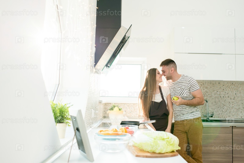 Красивый мужчина целует жену, готовя еду на кухне