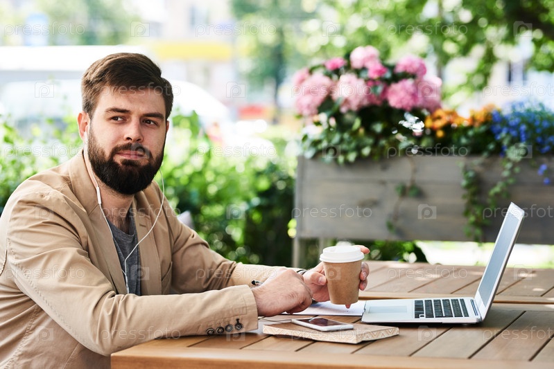 Бизнесмен использует ноутбук в современном кафе