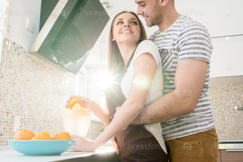 Счастливый парень обнимает девушку, выжимая сок