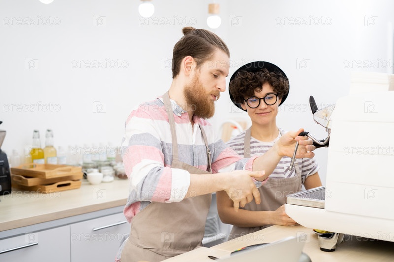 Опытный бариста учит нового сотрудника использовать машину для эспрессо