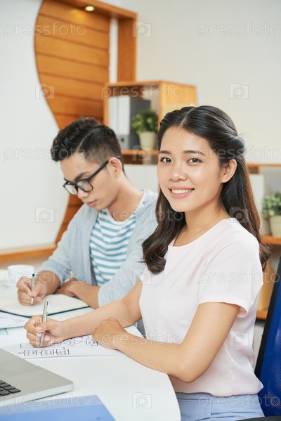 Красивая этническая женщина в офисе с коллегой