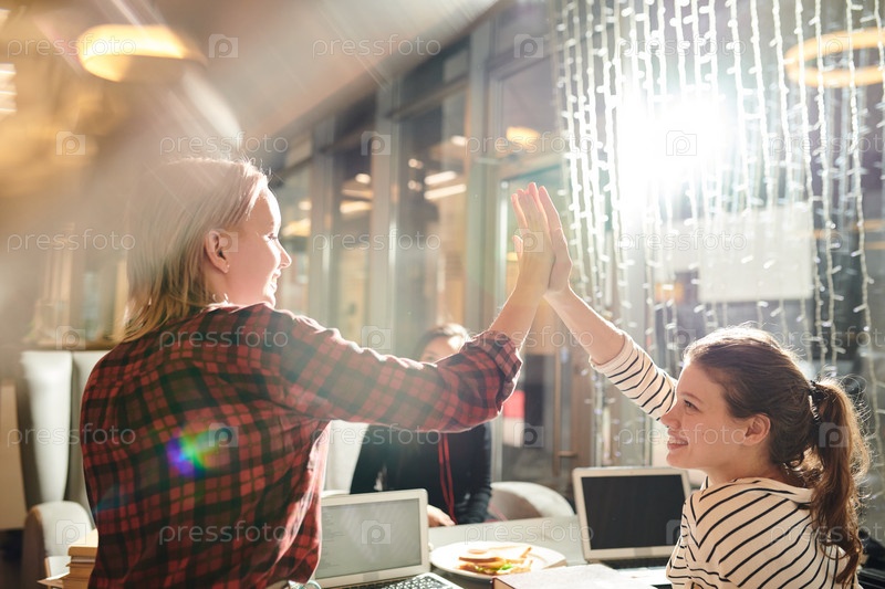 Девушки, дающие пятерку в кафе