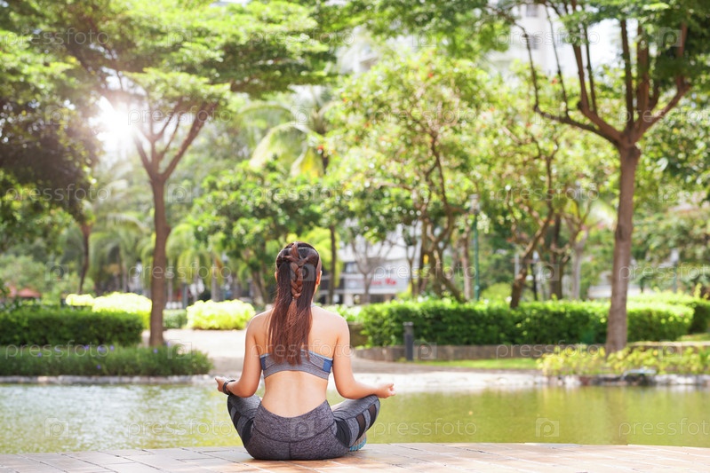 Женщина медитирует в зеленом парке