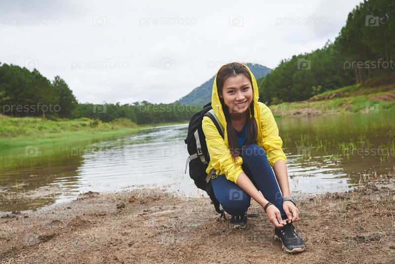 Путешественник, завязывающий шнурки обуви