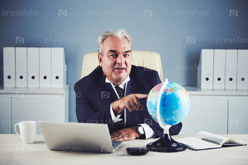 Зрелый бизнесмен планирует будущие каникулы using globe