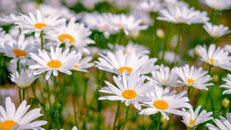Много ромашек. Цветочный фон. Белый, желтый и зеленый цвета