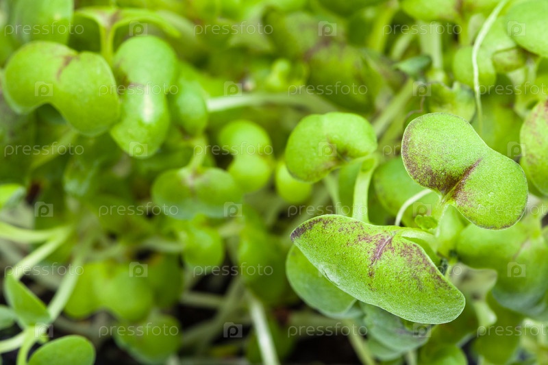 Листья зеленых ростков горчичного кресс-салата крупным планом