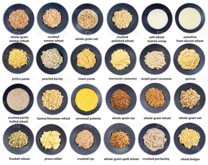 Набор видов сверху различных вареных круп с именами