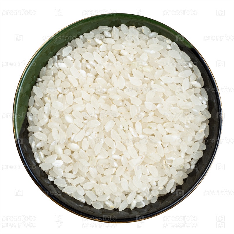 Полированный среднезернистый рис в круглой миске изолирован
