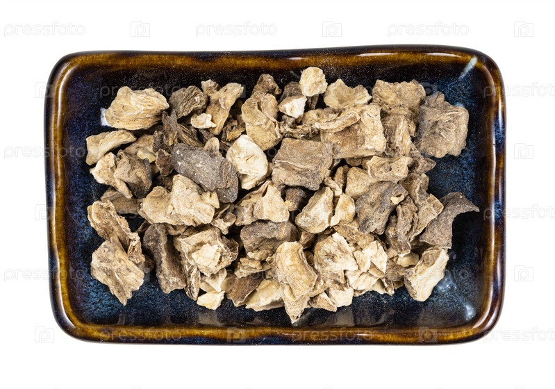 Сушеные корни цикория в керамической миске изолированы