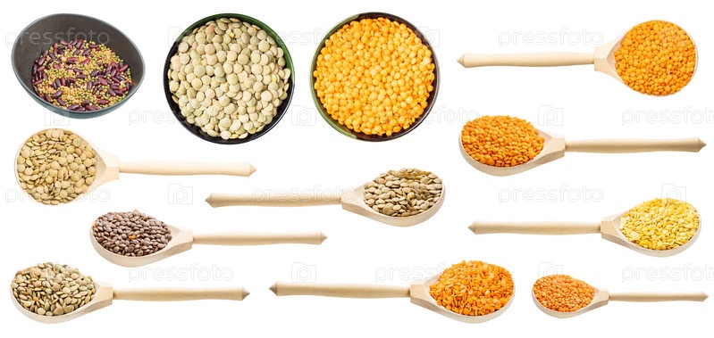 Набор различных сырых чечевиц, изолированных на белом