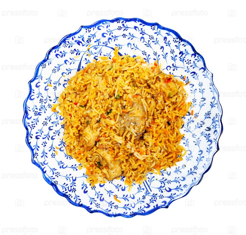 Вид сверху на курицу бирьяни на изолированной тарелке