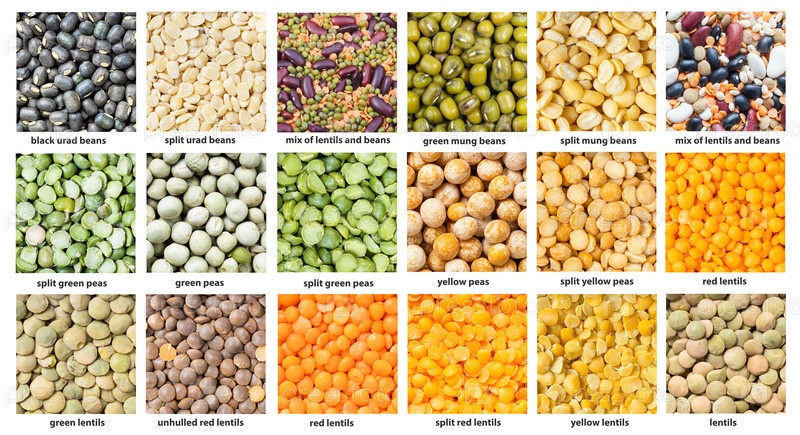 Различные чечевица и горох с именами крупным планом