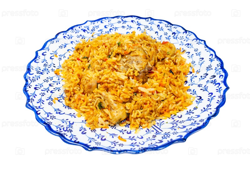Порция куриного бирьяни на тарелке изолирована