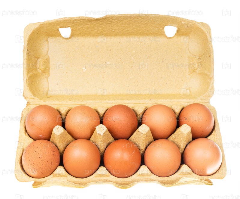 Десять коричневых куриных яиц в желтой коробке изолированы