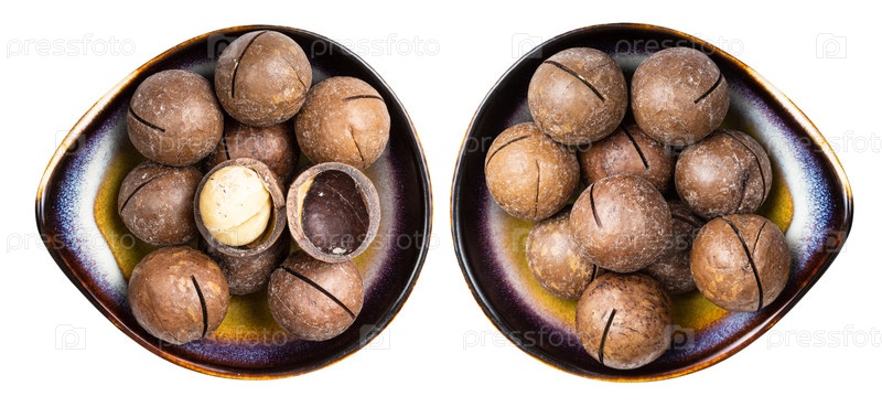 Набор орехов макадамия в керамических мисках изолированы