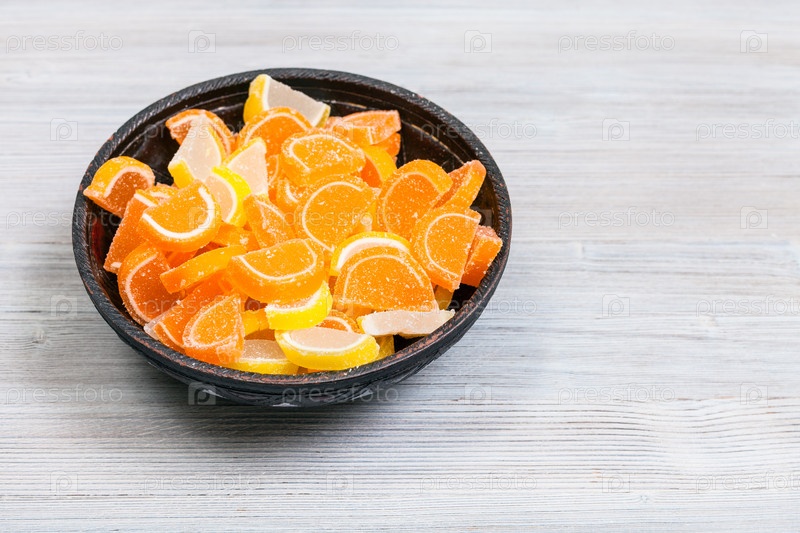 Сахарный лимон и апельсиновый мармелад в миске на столе