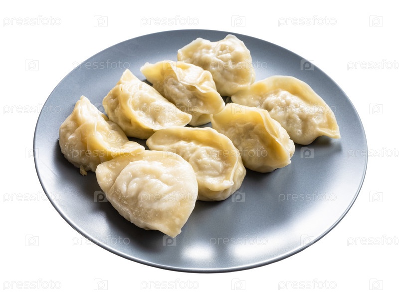 Несколько вареных пельменей на серой тарелке изолированы
