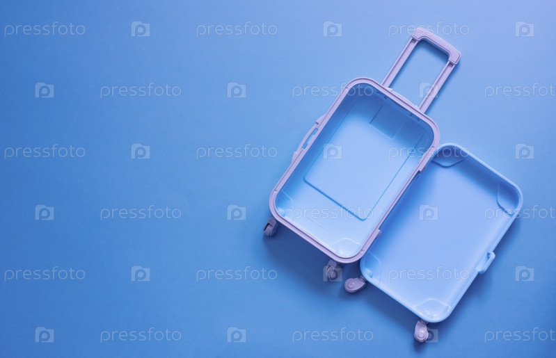 Полностью открытый синий чемодан, на синем фоне, вид сверху