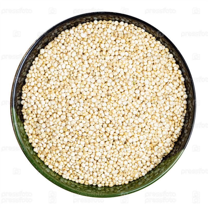 Вид сверху на зерна киноа в круглой миске изолирован