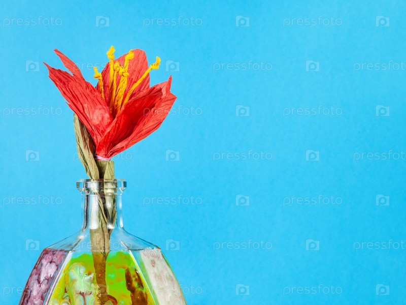 Бумажный красный цветок в раскрашенной вручную бутылке на синем