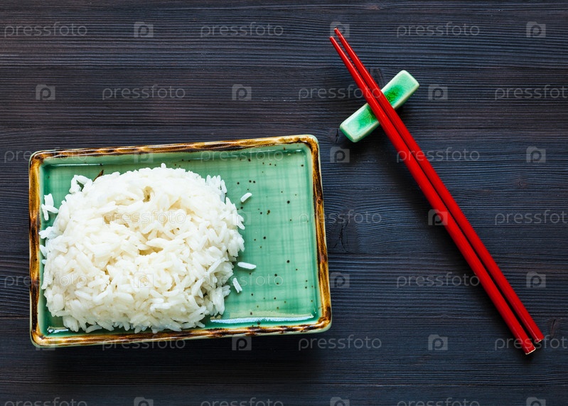 Порция вареного риса на тарелке и красные палочки для еды