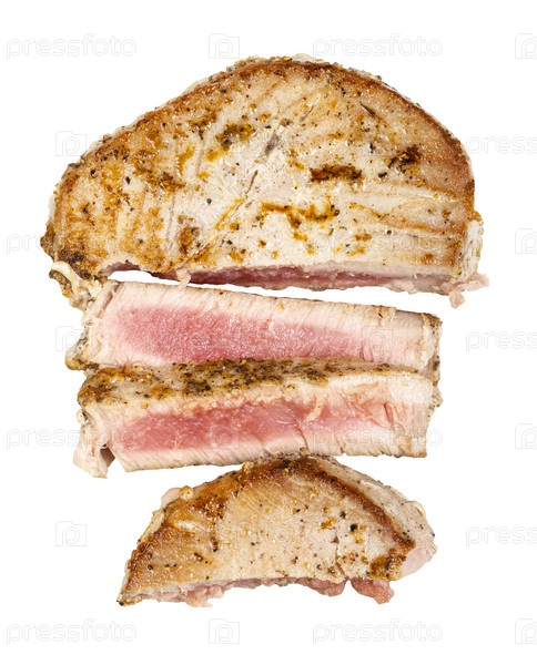 Вид сверху на нарезанный стейк из тунца на гриле изолирован