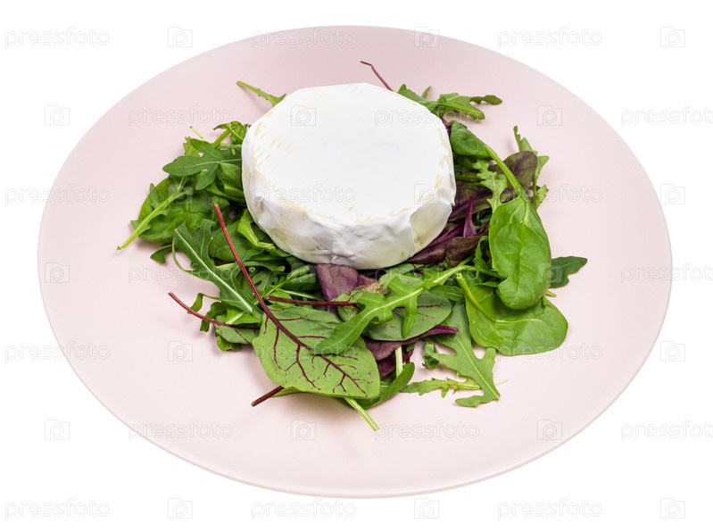 Мягкий сыр на свежей зелени на розовой тарелке изолированы
