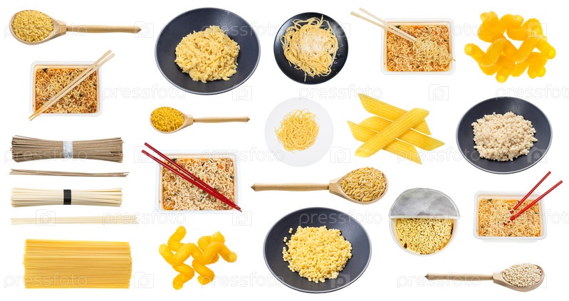 Набор различных вареных и сухих макарон и лапши