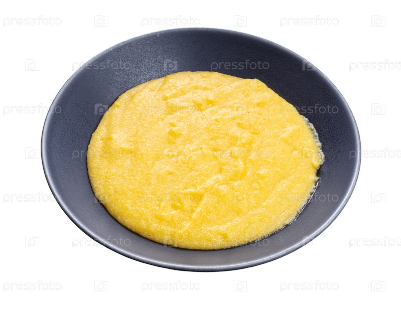 Приготовленная полента в серой миске, изолированная на белом