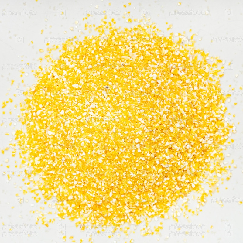 Куча грубой кукурузной муки крупным планом на сером