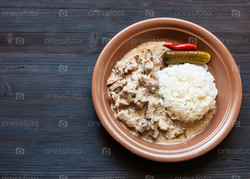 Порция бефстроганова на темном столе