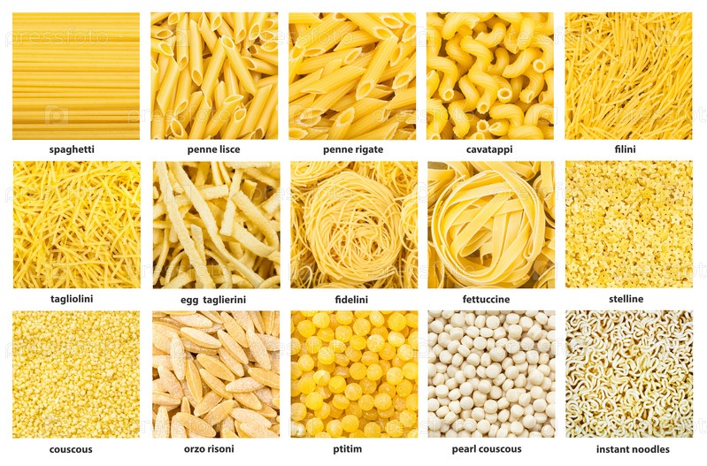 Различные пшеничные макароны и лапша с именами крупным планом