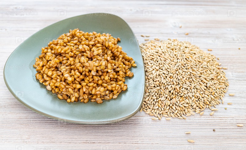 Сырые цельные зерна ржи и вареная каша на столе