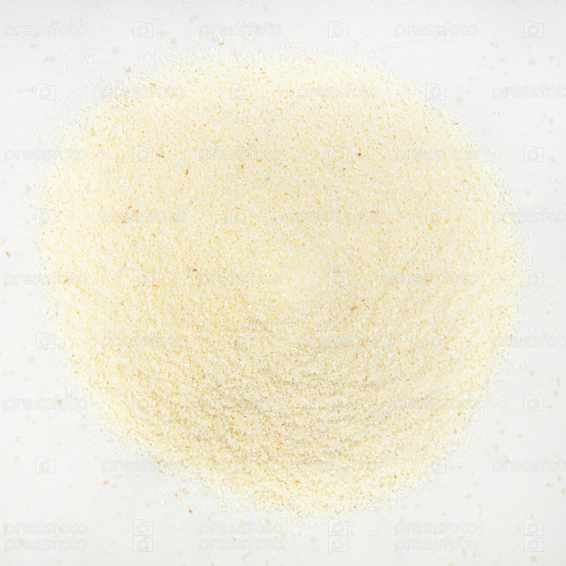 Куча манной крупы из мягкой пшеницы крупным планом на сером