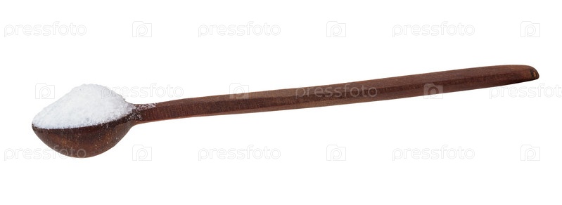 Вид сбоку на деревянную соляную ложку с мелкой морской солью