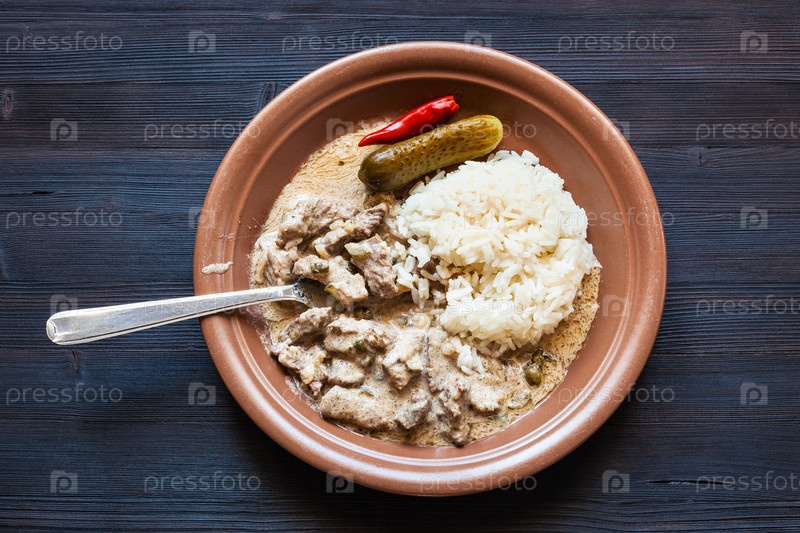 Есть блюдо Бефстроганов из коричневой тарелки