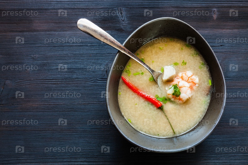 Вид сверху на миску с супом Том Кха Тале