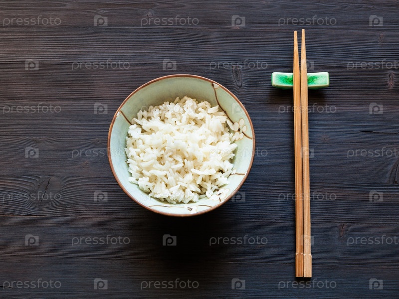 Отварной рис в миске и палочки для еды на отдыхе в темноте