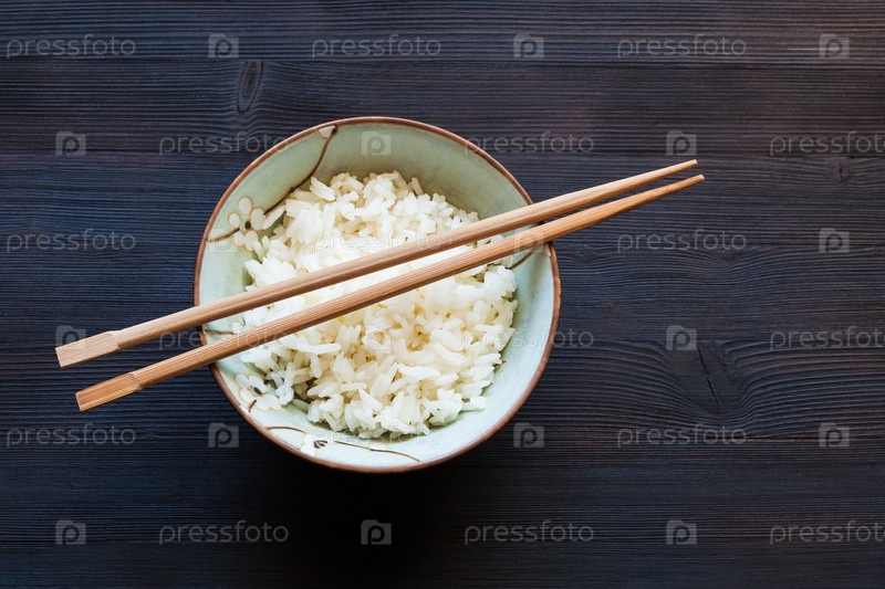 Палочки для еды над отварным рисом в миске на темном столе