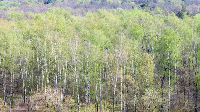 Березовая роща в лесу с первой зеленой листвой