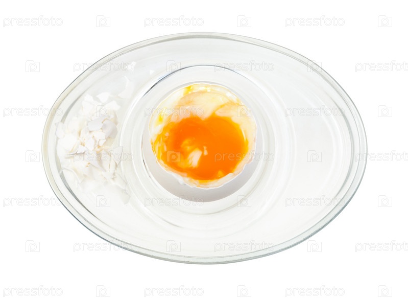 Вид сверху на открытое вареное белое яйцо в стеклянной чашке для яиц