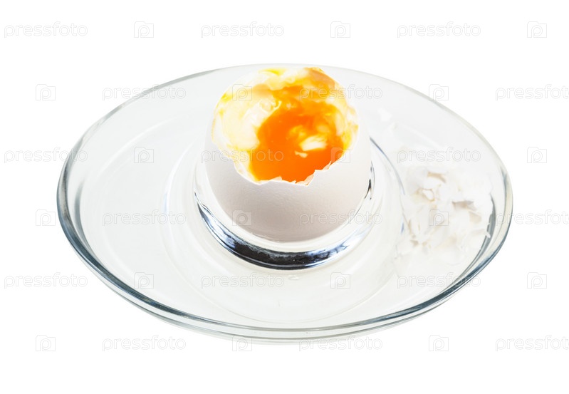 Открытое вареное белое яйцо в стеклянной чашке для яиц изолировано