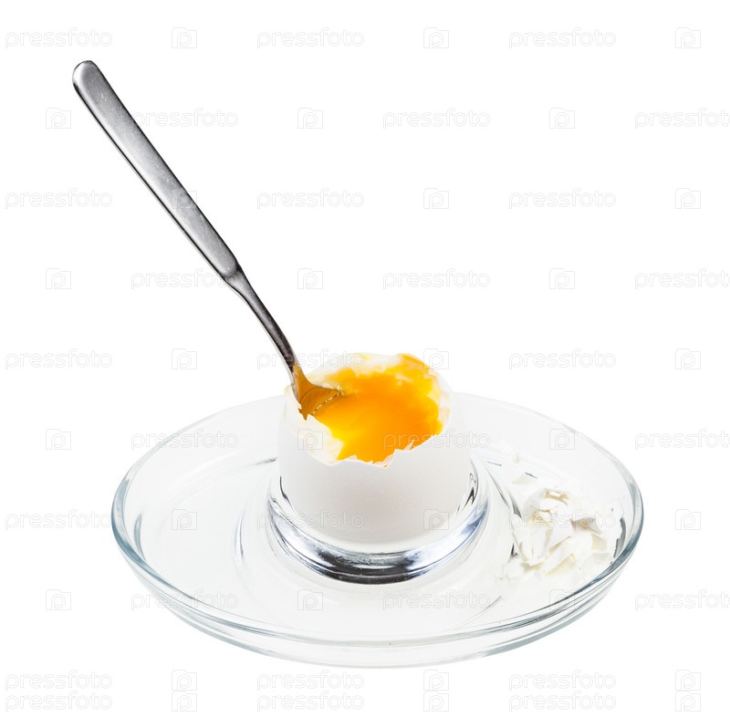 Открытое яйцо всмятку с ложкой в стеклянной чашке для яиц