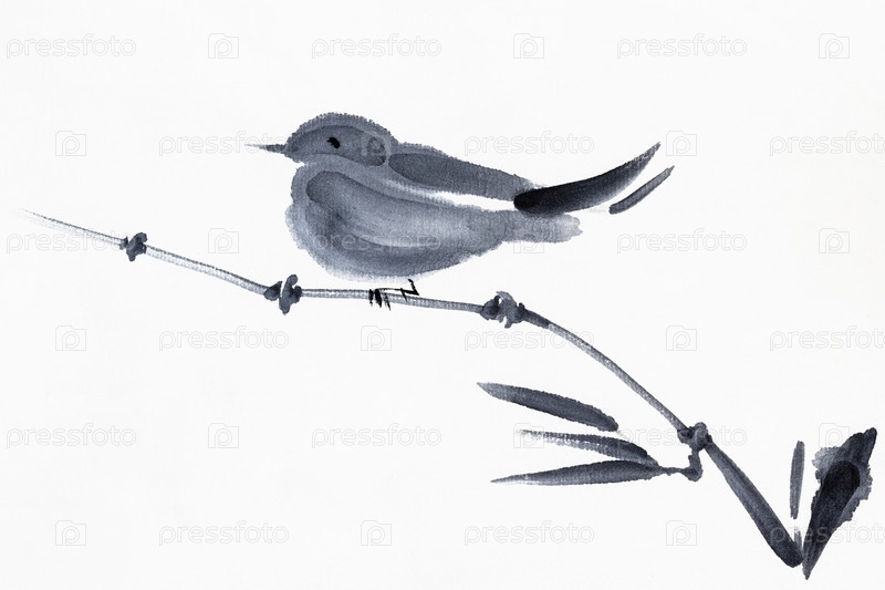 Воробей сидит на бамбуковой ветке рисованной