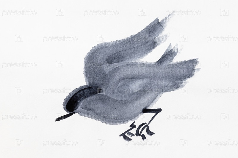 Летающая синица, нарисованная вручную суми-э на бумаге