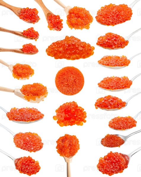 Коллаж из разных ложек с красной икрой лосося