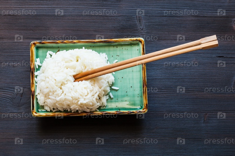 Вид сверху на отварной рис с палочками на тарелке