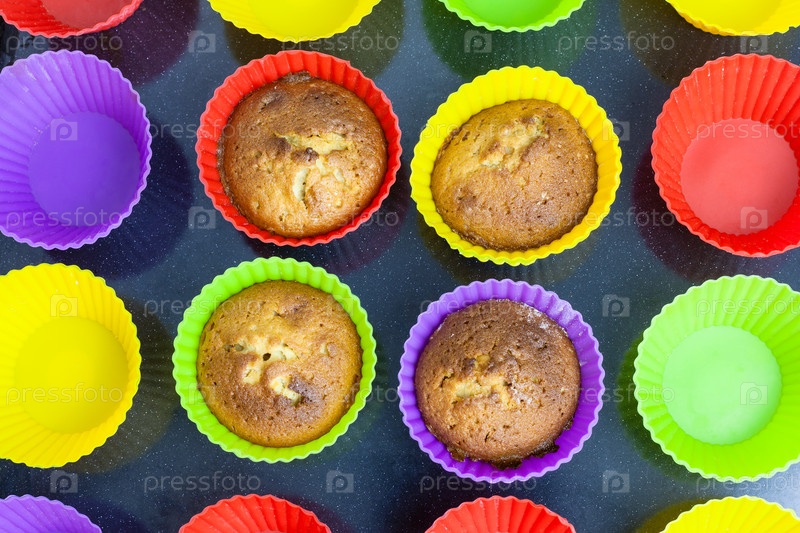 Вид сверху на четыре кекса в разноцветных формах