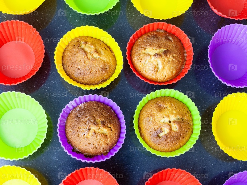 Вид сверху на четыре кекса в разноцветных формах